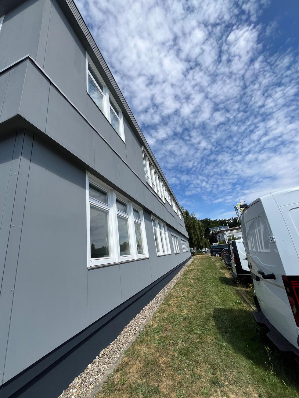 Im Rahmen dieses Projekts wurde die Fassade des ehemaligen Lager- und Bürogebäudes umfassend saniert. Zunächst entfernten wir die alte Fassadenverkleidung vollständig. Anschließend erfolgte die Montage neuer Aquapanel-Platten als stabile und witterungsbeständige Grundlage.